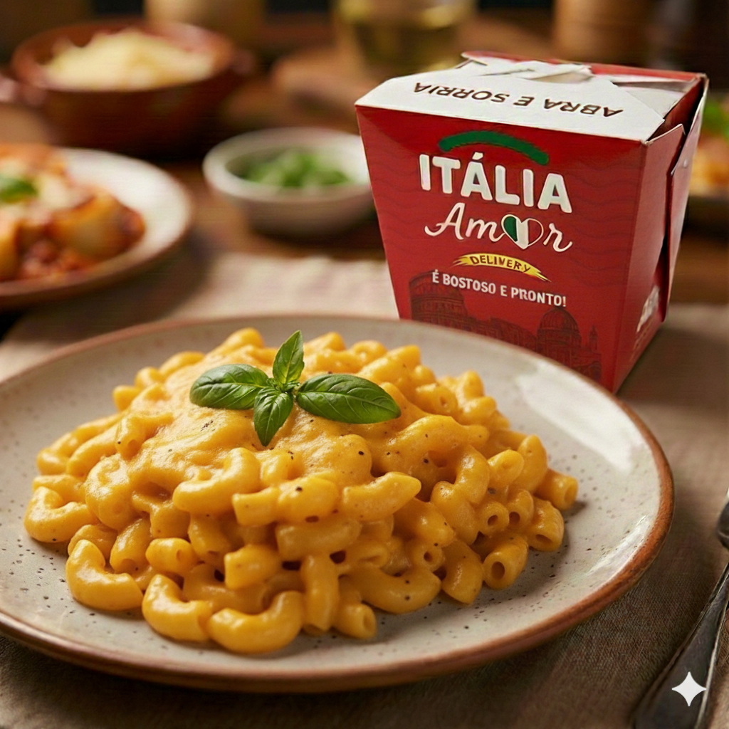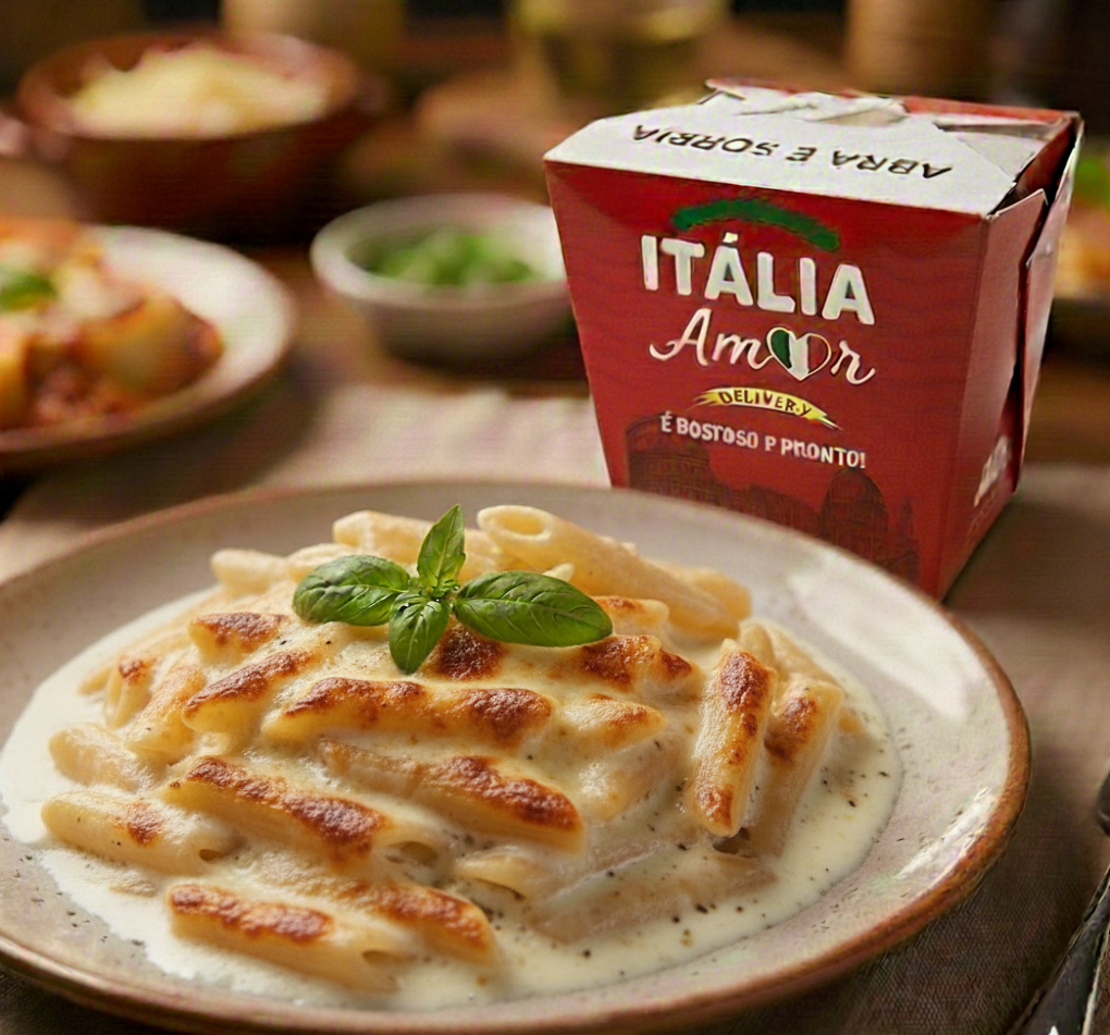Delicie-se com nosso penne artesanal envolto em um cremoso molho béchamel, finalizado com pedaços crocantes de bacon e uma cobertura generosa de mussarela derretida. Um sabor irresistível que combina cremosidade e textura em cada garfada.